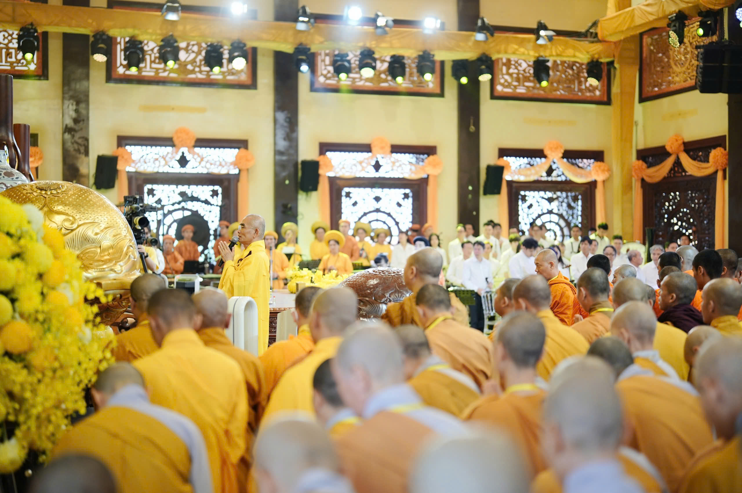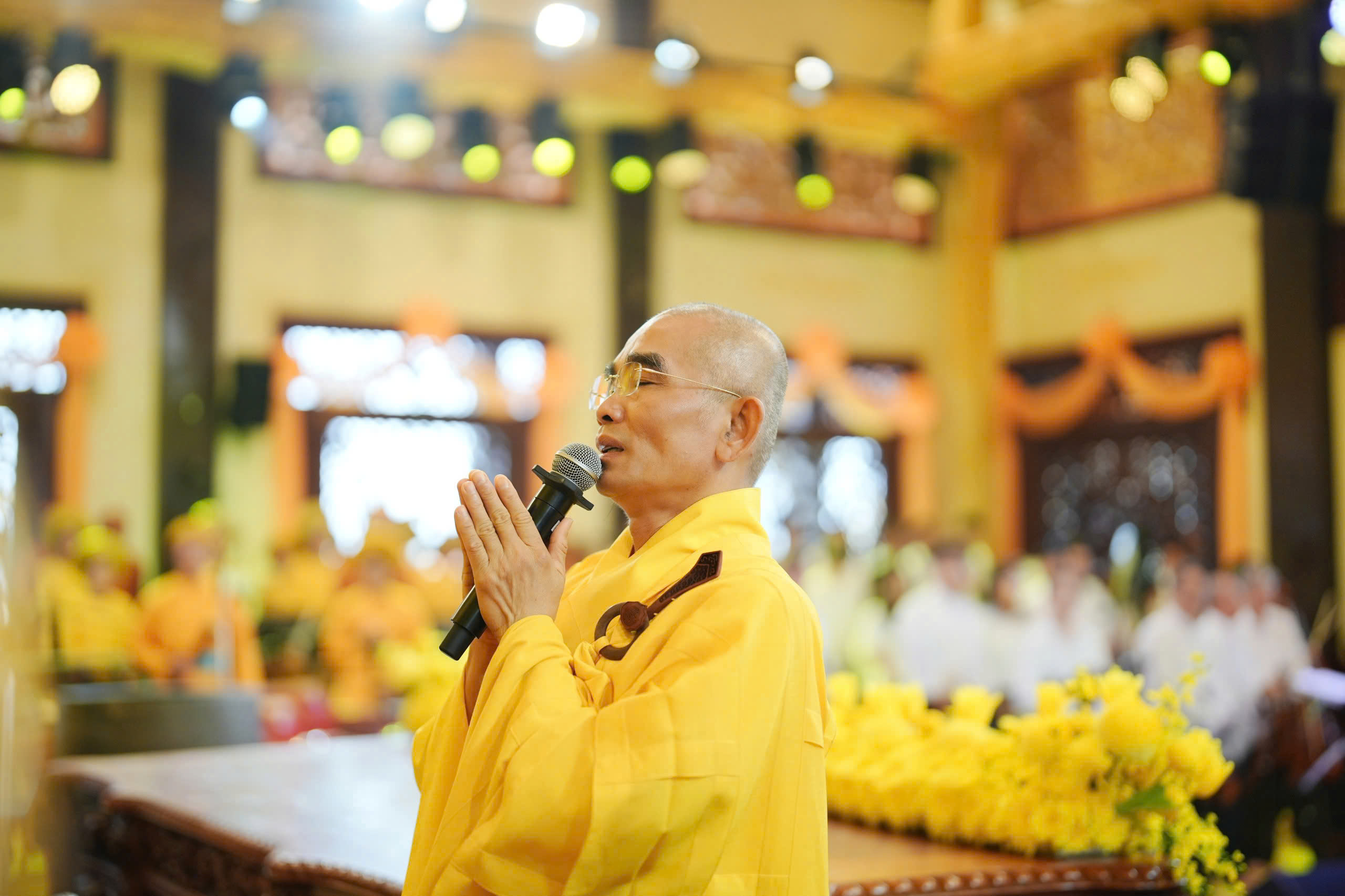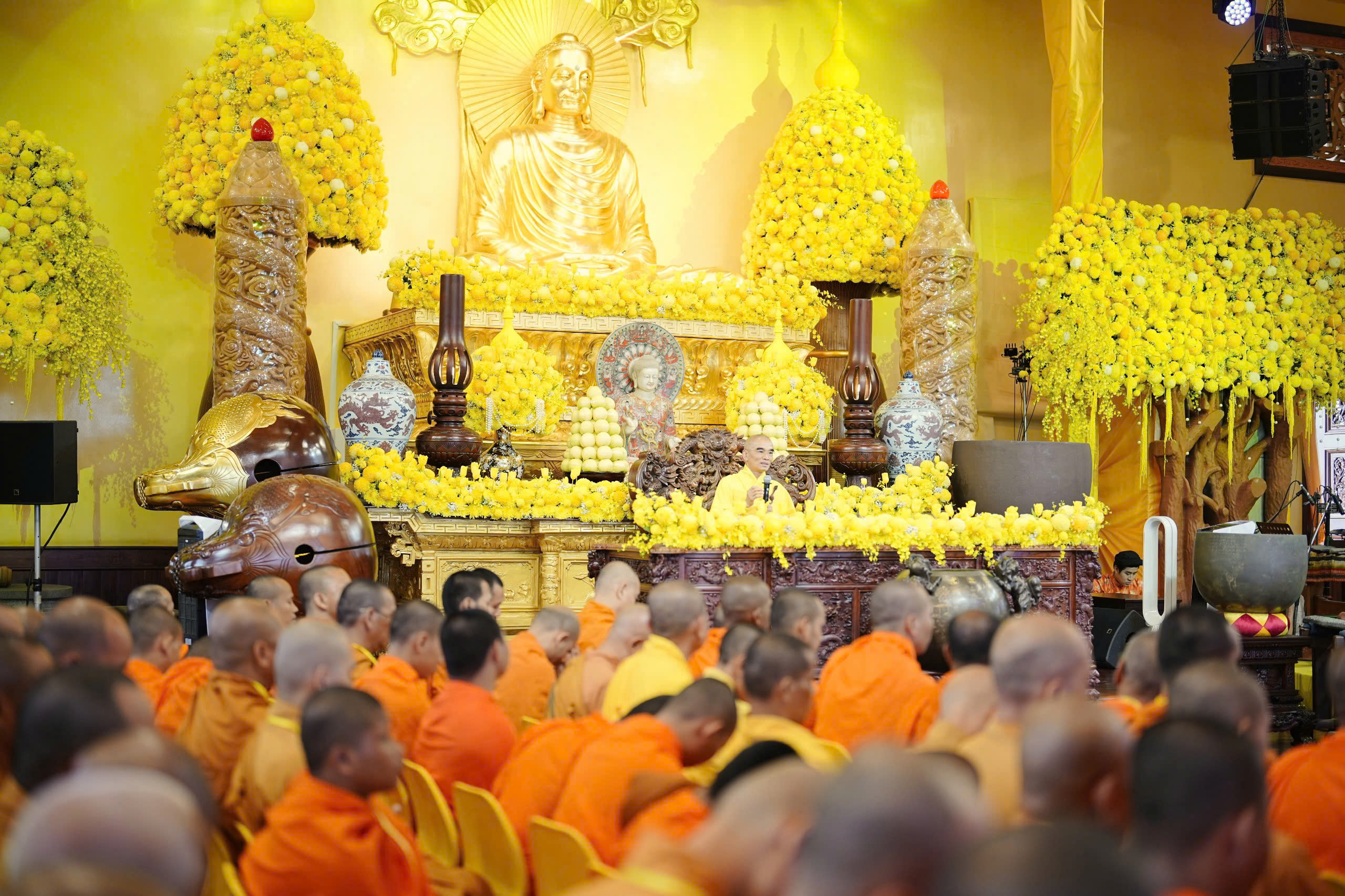 Sau nghi thức cung nghinh chư Tôn đức, tiếp nối là phần lễ Phật và niệm Phật cầu gia hộ. Thượng tọa Thích Tuệ Hải đã chia sẻ về ý nghĩa ngày Phật thành đạo.